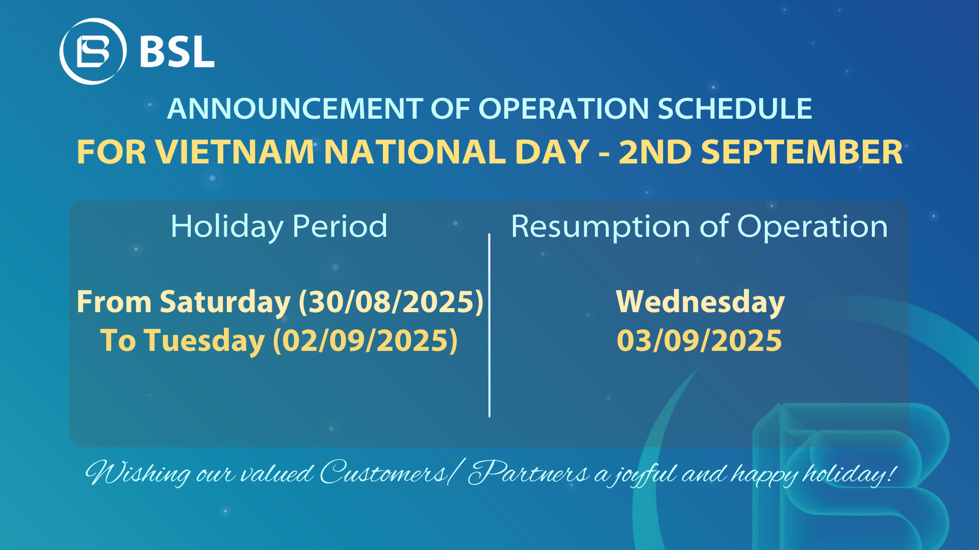 BIDV-SuMi TRUST Leasing Co., Ltd (BSL) would like to inform our valued Customers/Partners of BSL’s operations schedule for Vietnam National Day – 2nd September as follows: