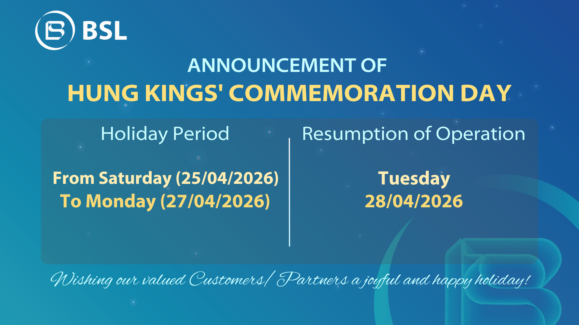 BIDV-SuMi TRUST Leasing Co., Ltd (BSL) would like to inform our valued Customers/Partners of BSL’s operations schedule for Hung Kings’ Commemoration Day as follows: