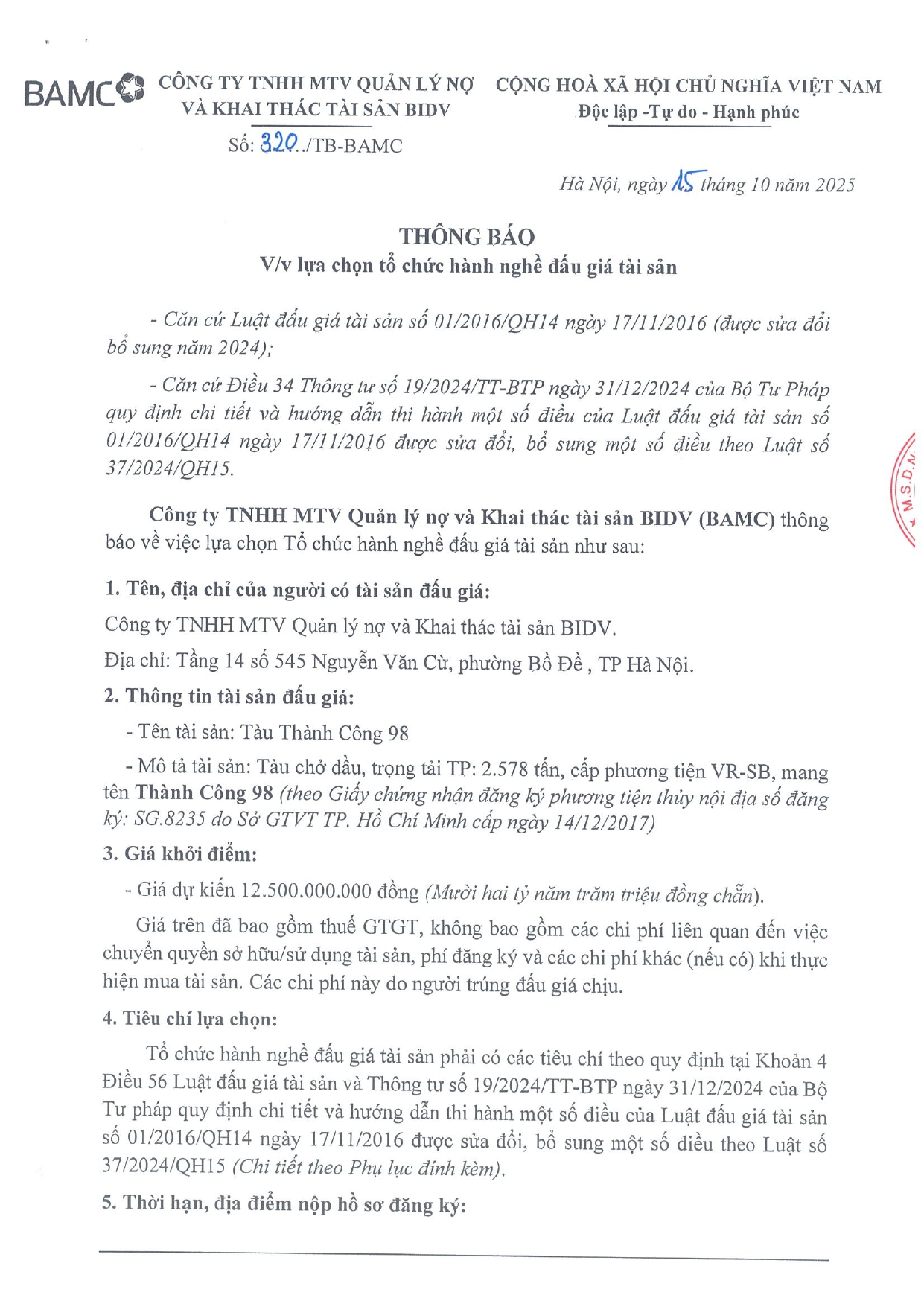 2025.10.17. Thông báo về việc lựa chọn tổ chức đấu giá tài sản