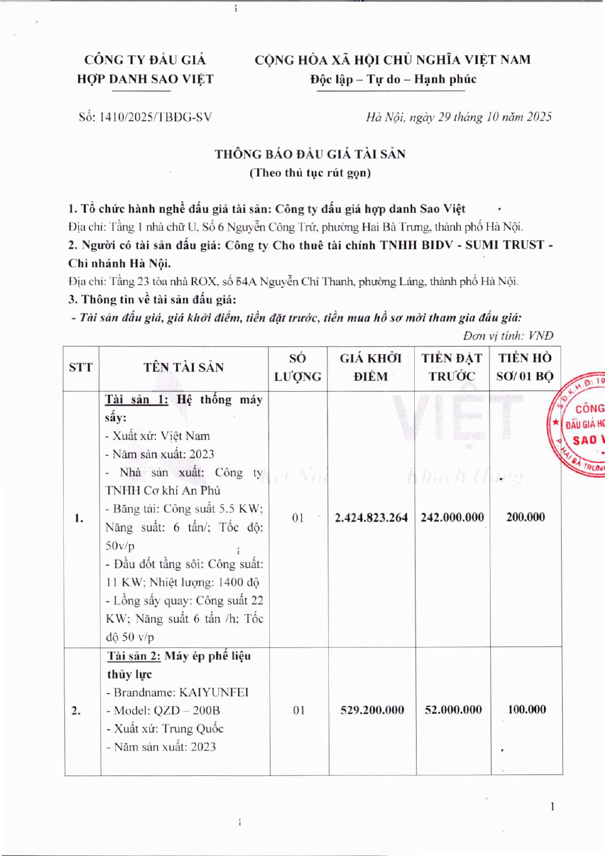 3. THÔNG BÁO ĐẤU GIÁ 1410.2025 – BIDV SUMI TRUST – MÁY SẤY+ÉP THỦY LỰC