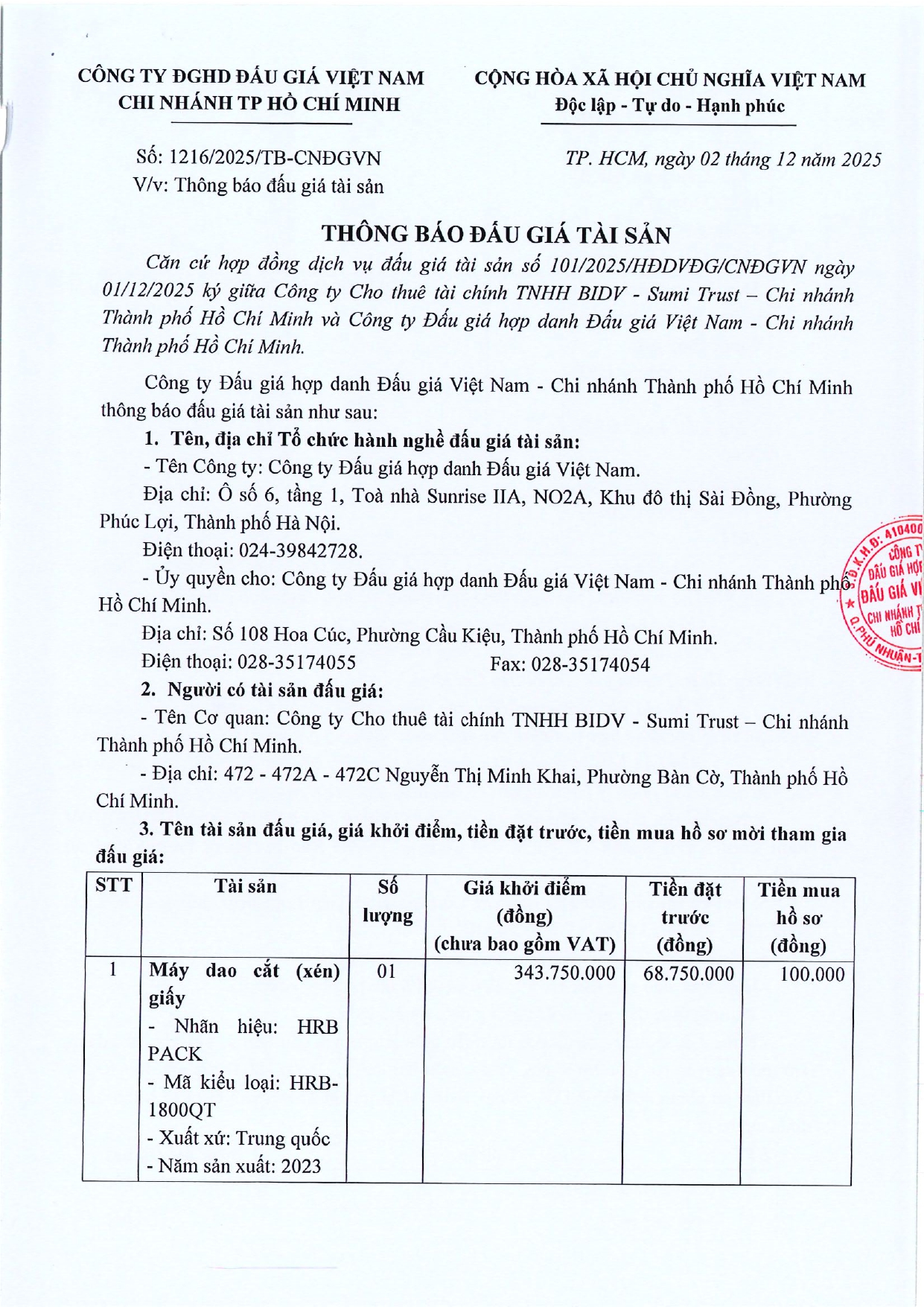 2025.12.02 Thông báo bán đấu giá lần 1
